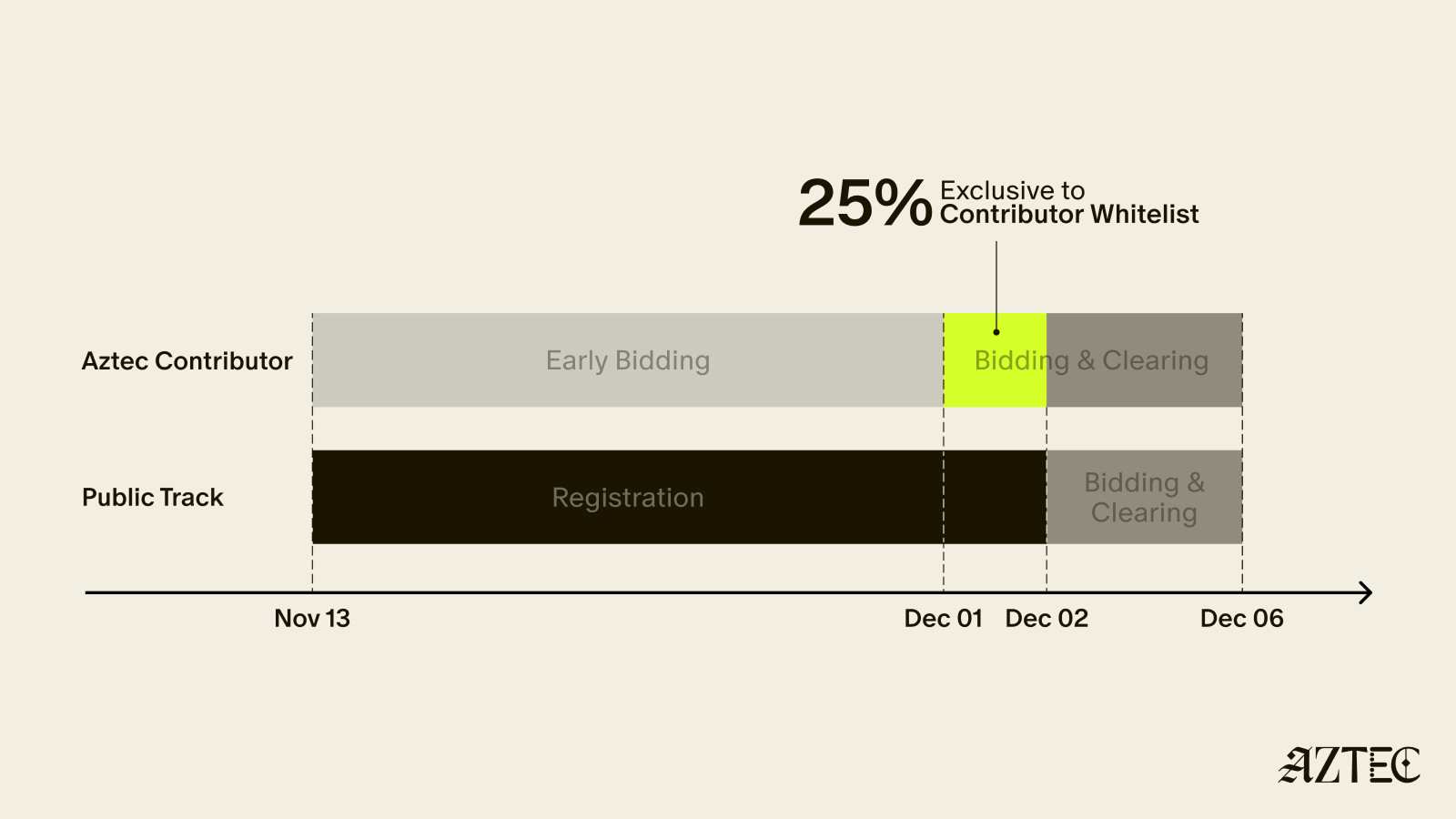 To pre-qualify for bidding, mint your KYC NFT and come back on December 2nd to submit your bid. The public sale track sale will run from December 2nd, 2025, to December 6th, 2025. Aztec has calendar reminders you can set and an automated email you can sign up for to remind you when the public sale track goes live.